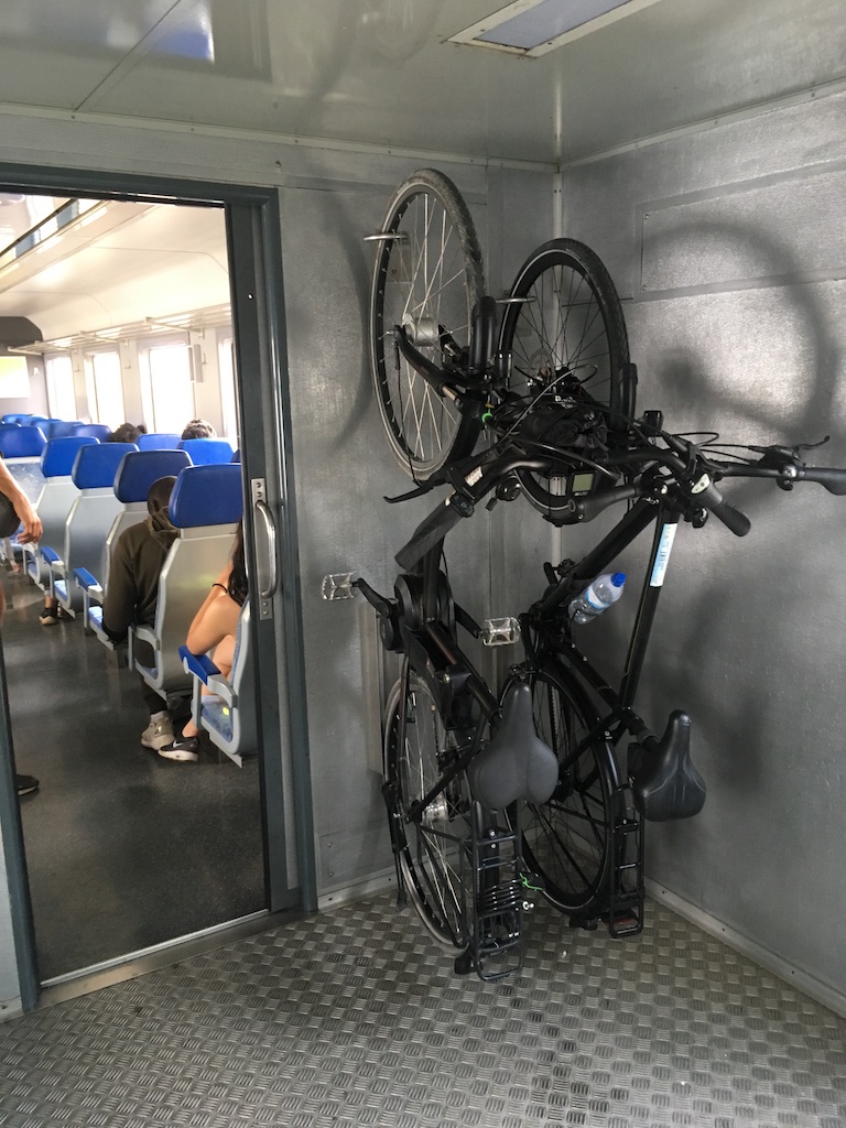 Acordamos cedo, tomamos um bom pequeno almoço na baixa de Faro e fomos buscar as bicicletas, já previamente reservadas. Como a localização da loja ficava a 2 min da estação de comboio, não demoramos muito a embarcar rumo a Vila Real de Santo António. A viagem dura cerca de 1h10m e tem partidas praticamente de hora a hora. Penduramos as bicicletas em local apropriado, no último vagão, e partimos à aventura da travessia do Algarve de bicicleta.