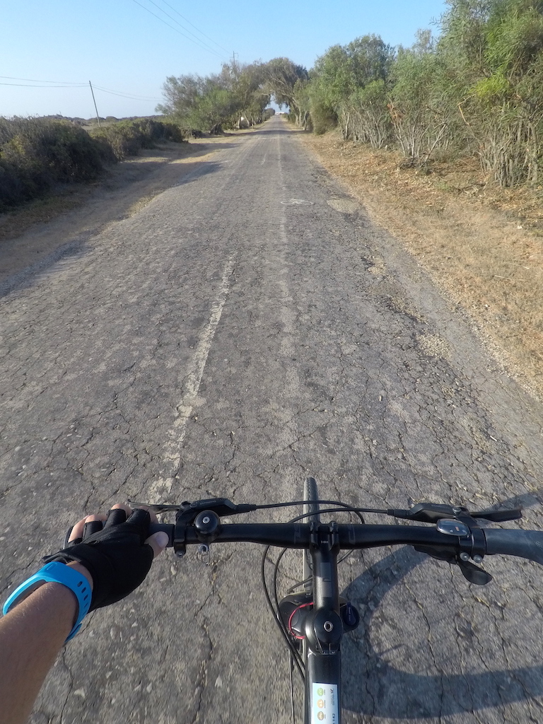 Pedalamos até Monte Gordo em asfalto, passamos pela praia, pedimos indicações para encontrar a ecopista novamente e fomos para Cacela Velha, o primeiro ponto de interesse, antes do destino final: Tavira.